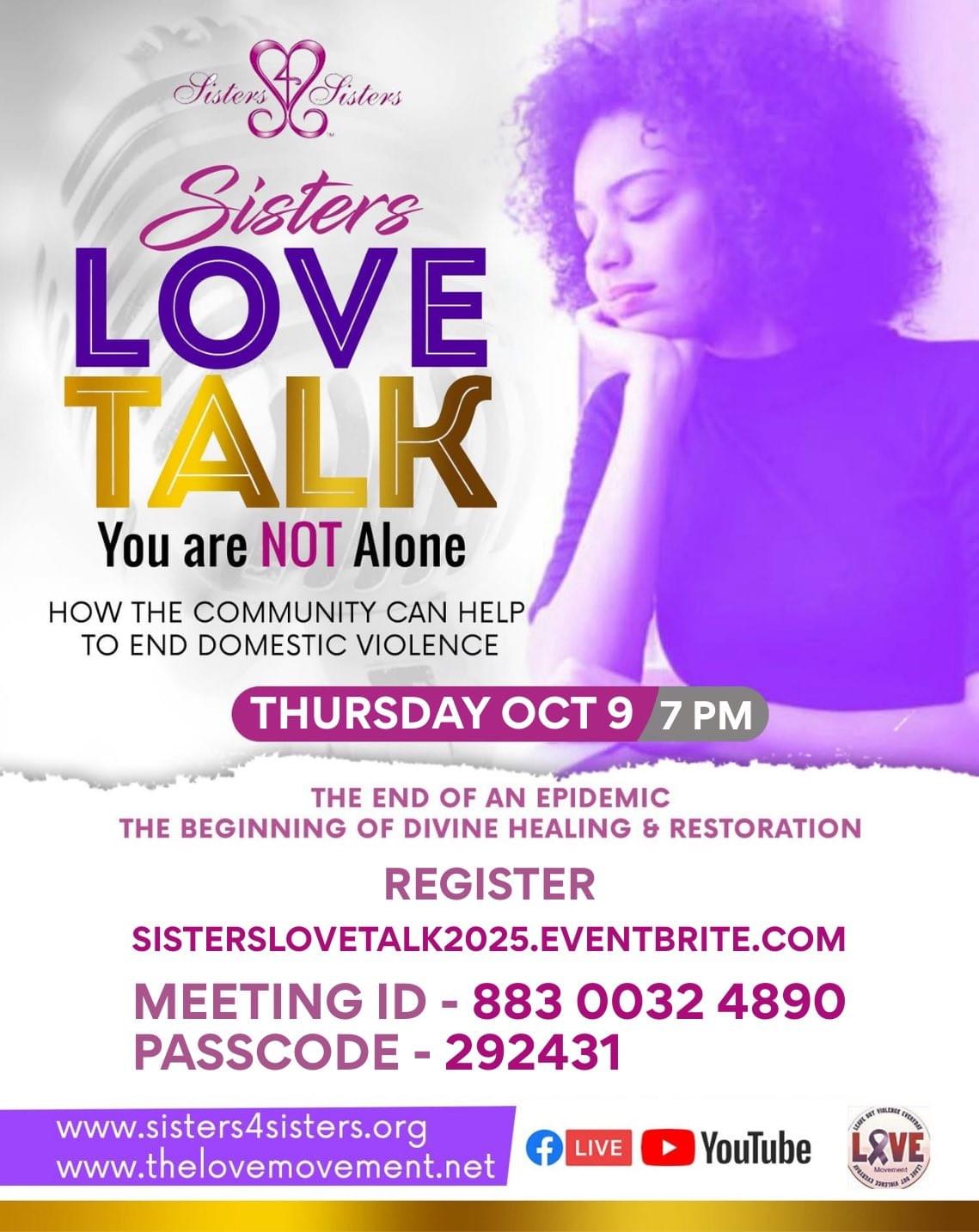 Sisters4Sisters,Inc.'s Domestic Violence Program- The LOVE Movement is dedicated towards educating, engaging and enlightening our community on domestic and sexual abuse through awareness, education and prevention programs along with providing resources and a link to care for those impacted by domestic-sexual violence.